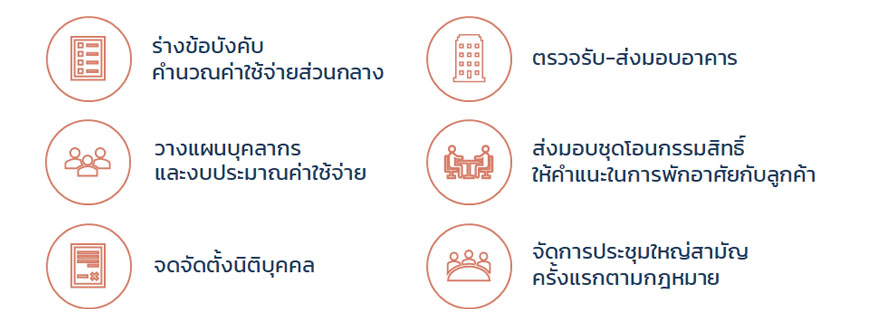 จากประสบการณ์มากกว่า 10 ปี ในฐานะตัวแทนผู้พัฒนาโครงการ ดําเนินการจัดตั้งนิติบุคคลฯ และดูแลผู้พักอาศัยตั้งแต่ลูกค้าโอนกรรมสิทธิ์ครั้งแรก เตรียมความพร้อมเพื่อการเข้าพักอาศัยของลูกค้า ประสานงานตรวจเช็คระบบความปลอดภัย ตลอดจนดูแลภูมิทัศน์ “First Impression” เป็นสิ่งทีให้เราให้ความสําคัญกับลูกค้า และผู้ใช้บริการ